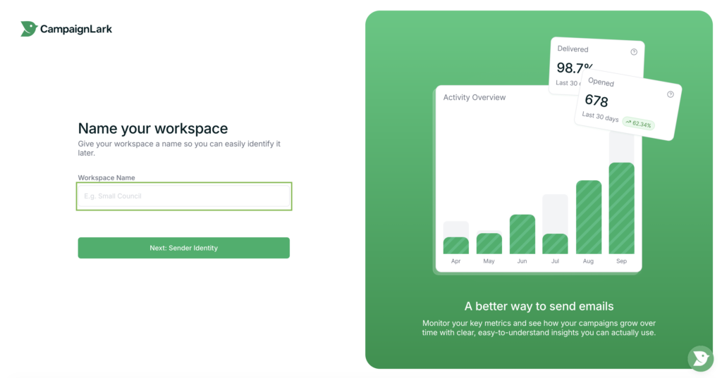 When you create a CampaignLark account for the first time, you will be guided through a simple setup process that includes creating your first workspace.
