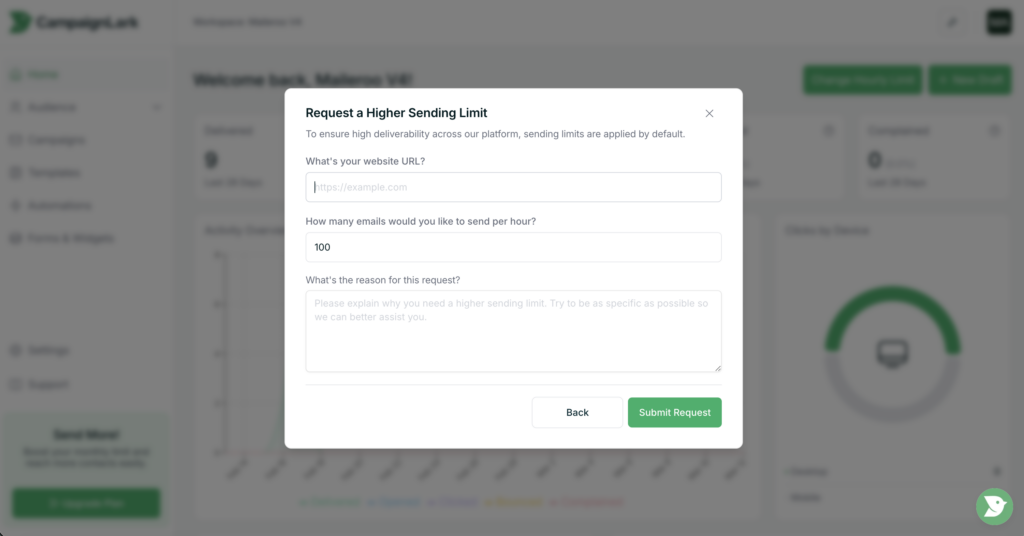 If approved, your workspace will be upgraded to the new hourly sending limit, allowing you to send emails at a higher rate.