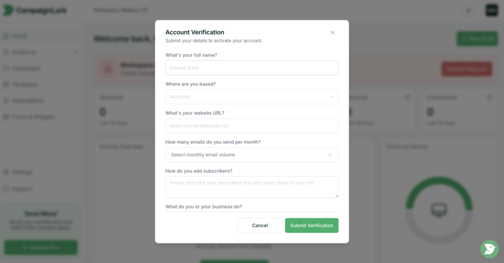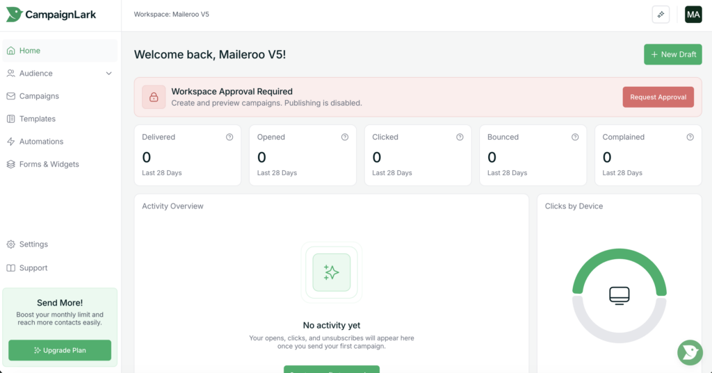 When you create a new workspace in CampaignLark, you will need to request approval before you can begin sending emails.